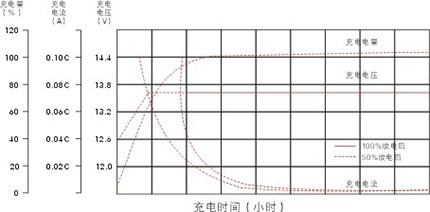 鉛酸蓄電池要求采用限流恒壓的充電方法進行充電。在環(huán)境度為25℃的條件下,最佳的浮充電壓為13.6±0.1V 臺X臺數(shù),充電開始時的電流應限制在0.25C10A的范圍內。