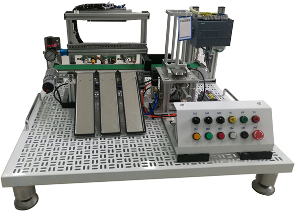 (4)按鈕模塊采用型材底座,安裝面板與桌面成45°夾角,包含急停按鈕1只,旋鈕開關(guān)3只,自鎖帶燈按鈕黃、綠、紅各1只,所有按鈕和旋鈕觸點(diǎn)均引至端子接線排上;自動(dòng)上料模塊主體安裝在工業(yè)型材上,結(jié)構(gòu)由鋁型材構(gòu)成,方型工件庫1件,物料推出機(jī)構(gòu)1件,光電傳感器,單缸氣缸1只,主要完成將工件庫中的工件依次推出;傳輸線模塊主要包含直流電機(jī)1臺(tái),滾動(dòng)軸承4只,滾輪2只,傳輸帶1條,主要完成將工件輸送到分揀區(qū);物料檢測(cè)及分揀模塊主要包含氣缸3個(gè),電感傳感器1只,電容傳感器1只;漫反射式光電傳感器1只,物料分揀槽3個(gè),完成物料的分揀工作。調(diào)壓閥主要安裝在型材底座支架上,含有手滑閥可控制氣路的通斷和壓力。輔助器件包含接線端子、物料、實(shí)訓(xùn)導(dǎo)線、氣管等,模型控制所需的I/O點(diǎn)數(shù)與所配主機(jī)I/O點(diǎn)數(shù)相配套。氣缸使用范圍0.1-1MPa,工作溫度-15-60℃,活塞帶磁環(huán)可完成檢測(cè);光電傳感器檢測(cè)范圍不小于1CM,輸出電流80-200MA,防護(hù)等級(jí)IP65,輸出方式NPN常開;傳感器檢測(cè)范圍不小于1CM,輸出電流80-200MA,防護(hù)等級(jí)IP65,輸出方式NPN常開。