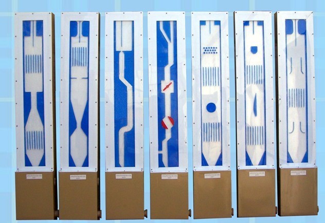 四、漸擴漸縮:在漸縮管看到流線的逐漸收縮,在漸擴處看到因邊界層分離而產(chǎn)生的明顯旋渦現(xiàn)象。