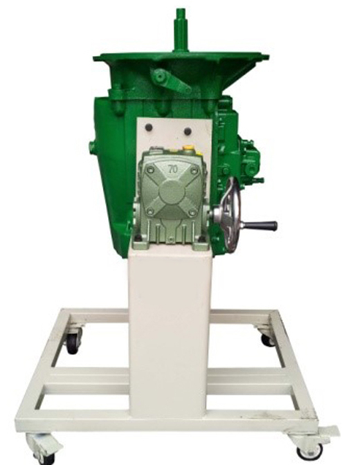 1.采用翻新天錦EQ1120GA2 8JS125TA型手動變速器總成(附件齊全,易于拆裝),并裝在專用翻轉(zhuǎn)架上。 采用減速翻轉(zhuǎn)機構(gòu),可使變速器旋轉(zhuǎn)任意角度,并能任意位置鎖止,便于學(xué)生從不同的角度進(jìn)行拆卸和裝配。