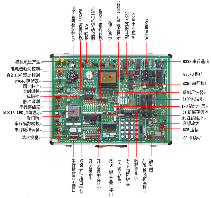 含箱體、電源、51單片機(jī)系統(tǒng)和微機(jī)接口8088系統(tǒng)以及標(biāo)配實驗電路 |