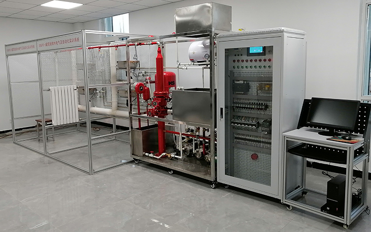 2、消防給水系統(tǒng):主要有給水箱、噴淋泵、穩(wěn)壓罐、濕式報(bào)警閥、壓力開(kāi)關(guān)、水流指示器、消防給水管道、閉式噴淋頭等組成。管路采用鍍鋅管進(jìn)行設(shè)計(jì),可進(jìn)行鍍鋅管的切割、套絲、安裝和通水試驗(yàn)操作,通過(guò)控制系統(tǒng)可實(shí)現(xiàn)噴淋滅火功能。