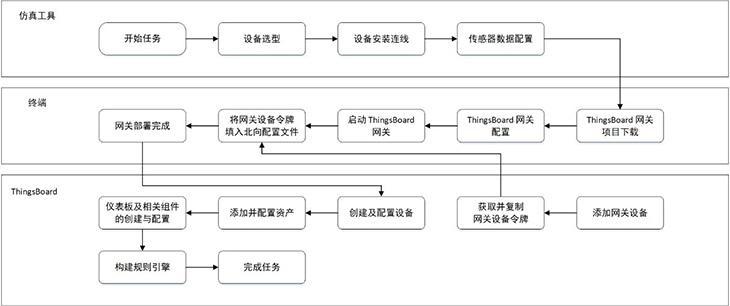 模擬智慧牧場(chǎng)系統(tǒng)還引入使用開(kāi)源軟件平臺(tái)ChirpStack與ThingsBoard,結(jié)合LPWAN技術(shù),實(shí)現(xiàn)遠(yuǎn)程低功耗數(shù)據(jù)采集、上報(bào)和展示。在ChirpStack平臺(tái)上,用戶可對(duì)網(wǎng)關(guān)、GPS、溫濕度傳感器等設(shè)備進(jìn)行配置,以上送仿真實(shí)驗(yàn)中的虛擬數(shù)據(jù)。在ThingsBoard平臺(tái)上,設(shè)置牧場(chǎng)地圖、告警信息、溫濕度等各儀表盤組件;獲取仿真設(shè)備上送的數(shù)據(jù),并將數(shù)據(jù)以圖表形式作可視化呈現(xiàn);以及基于流式編程添加相應(yīng)的規(guī)則策略,最終完成模擬智慧牧場(chǎng)實(shí)訓(xùn)場(chǎng)景的部署搭建。