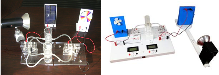 燃料電池教具是利用光線照射在太陽能電池板上產(chǎn)生電能,然后利用產(chǎn)生的電能作用在電解電池模塊上,使水發(fā)生電解產(chǎn)生氫氣和氧氣。氫氣和氧氣進入到發(fā)電模塊產(chǎn)生電能,帶動風(fēng)扇轉(zhuǎn)動。