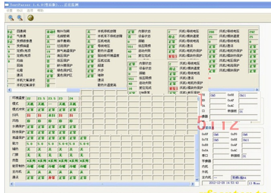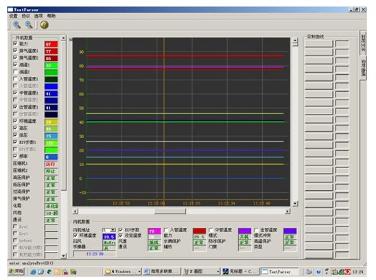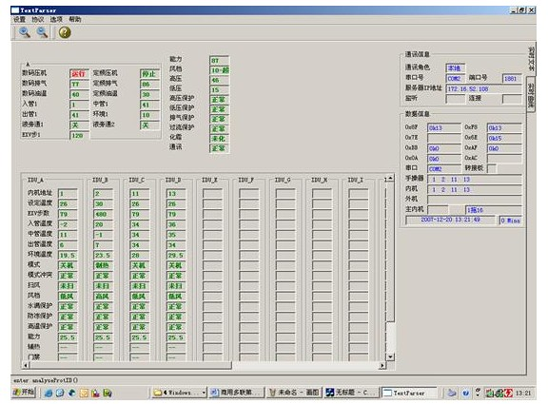 中央空調(diào)機(jī)由于工程復(fù)雜,設(shè)備分散,有的已經(jīng)裝修在開花板上測試程序,一但出現(xiàn)了故障,工程量相當(dāng)大,為了能夠快速準(zhǔn)確地測出故障是由主機(jī)機(jī)組還是室內(nèi)機(jī)的故障的,每個(gè)生產(chǎn)廠家根據(jù)生產(chǎn)的和維修的需要而開發(fā)了中央空調(diào)測試程序?蓽y試壓縮機(jī)的運(yùn)轉(zhuǎn)頻率,傳感器的各種數(shù)據(jù),電子膨脹閥的工作步數(shù)等幾十種中央空調(diào)的工作數(shù)據(jù)和狀態(tài),軟件可實(shí)現(xiàn)對內(nèi)機(jī)的控制,,可以對1-64臺(tái)內(nèi)機(jī)的狀態(tài)進(jìn)行設(shè)定。是高校提供了好的研究的學(xué)習(xí)設(shè)備。