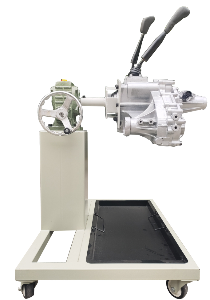 采用減速翻轉(zhuǎn)機構(gòu),可使變速器旋轉(zhuǎn)任意角度,并能任意位置鎖止,便于學生從不同的角度進行拆卸和裝配。
