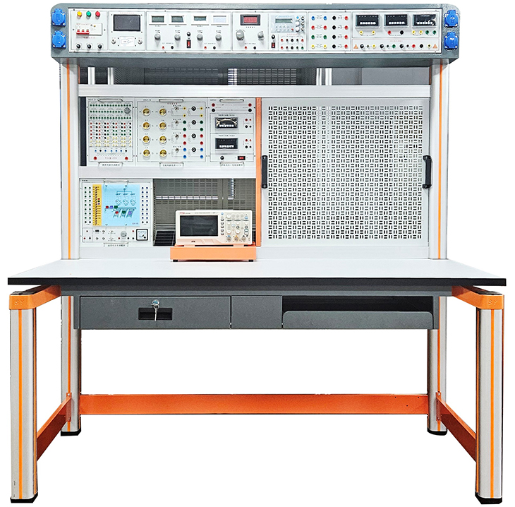 實(shí)驗(yàn)桌后面二支桌腳向上延伸,配上特制拉模成型的帶滑槽橫梁鋁型材組成實(shí)訓(xùn)屏,實(shí)訓(xùn)時左邊放置電氣實(shí)訓(xùn)掛箱(2層)及示波器支架,右邊裝置網(wǎng)孔板等,實(shí)訓(xùn)掛箱、網(wǎng)孔板在實(shí)訓(xùn)屏上實(shí)訓(xùn)時上下方便,左右移位自如。實(shí)訓(xùn)屏頂部安裝主機(jī)箱,實(shí)訓(xùn)屏底部安裝實(shí)驗(yàn)儀器工作電源箱。
