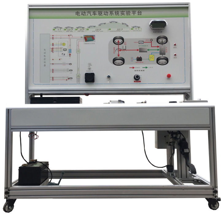 檢測(cè)控制面板(裝有各種檢測(cè)端子,1448×940mm彩色電路圖和工作原理示意圖)、組合儀表、點(diǎn)火開關(guān)、電機(jī)控制器、車載充電器與充電接口、DC-DC轉(zhuǎn)換器、鋰動(dòng)力電池組、電動(dòng)車電機(jī)(直流無刷電機(jī))與變速箱、后輪左右液壓制動(dòng)裝置、驅(qū)動(dòng)橋傳動(dòng)裝置、剎車開關(guān)、檔位開關(guān)、油門控制裝置、大電流繼電器、電源總開關(guān)、急停開關(guān)、輔助蓄電池(12V45AH)、一體化全鋁合金型材搭建的移動(dòng)臺(tái)架(1500×700×1700mm (帶自鎖腳輪裝置,帶安裝檢測(cè)端子的原理面板,面板1448×940mm)、故障考核系統(tǒng)、設(shè)備操作說明書。