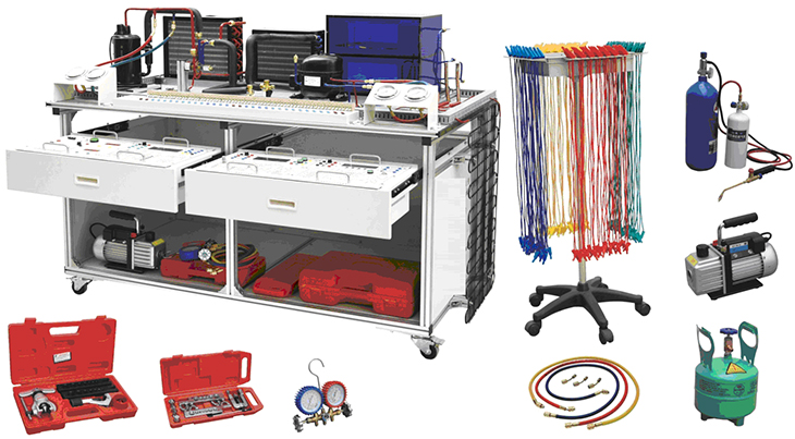 1、實(shí)訓(xùn)臺采用鋁型材臺架加實(shí)訓(xùn)模塊結(jié)構(gòu),裝置采用一體化設(shè)計(jì),由導(dǎo)軌式鋁合金安裝平臺、空調(diào)系統(tǒng)、電冰箱系統(tǒng)、電氣控制系統(tǒng)等組成。底部安裝有四個(gè)帶剎車的腳輪,可以方便的移動和固定。設(shè)備配置空調(diào)制冷系統(tǒng)管路1套、直冷電冰箱制冷系統(tǒng)管路1套、安全插端子排,壓力表(1.5MPa)2只(3.5 MPa)2只等。
