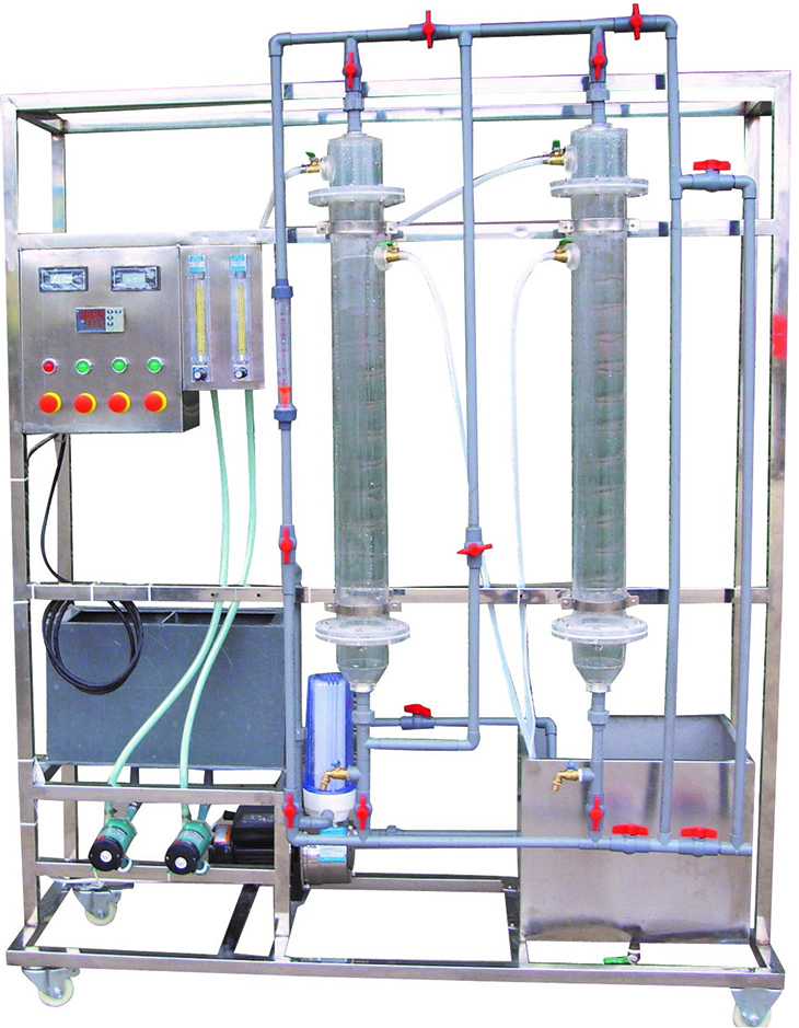 離子交換實驗裝置由陰、陽交換柱、耐酸堿泵、離子交換樹脂、液體轉(zhuǎn)子流量計、原水箱、淡水槽、濃水槽、再生液投配裝置、防腐工程塑料管道閥門、電導率儀、不銹鋼框架、控制屏等組成。