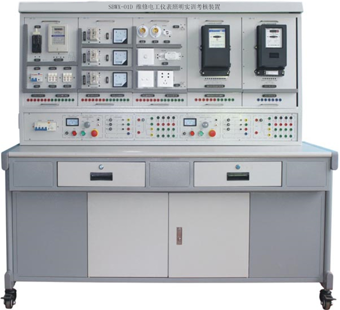 初級維修電工實訓(xùn)室設(shè)備可作為維修電工考核裝置,有可在網(wǎng)孔板上進行照明器件及線路的安裝,電工儀表測量線路的安裝、電工儀表測量線路的安裝、配電盤的裝配訓(xùn)練,電動機的控制線路安裝訓(xùn)練。